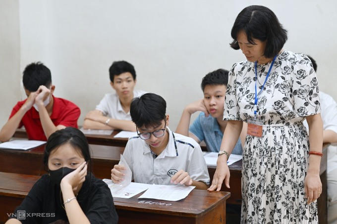 Giáo viên hướng dẫn học sinh làm thủ tục thi vào lớp 10 ở Hà Nội,năm 2024. Ảnh: Giang Huy