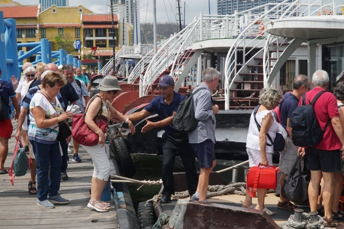 Du khách nước ngoài xuống tàu tham quan vịnh Hạ Long. Ảnh: Lê Tân