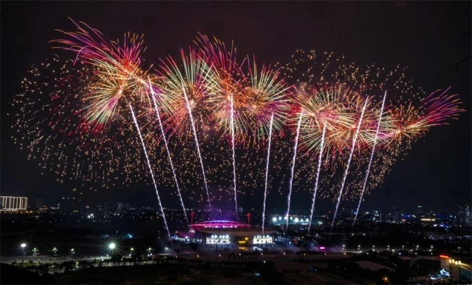 Các trận địa pháo hoa được bố trí trên mái của sân và bên trong cổng phía đường Lê Quang Đạo - Lê Đức Thọ. Khoảng 10.000 đơn vị pháo hoa,trong đó 4.600 quả tầm cao,950 giàn phun và 4.400 ống pháo hoa hỏa thuật,được sử dụng. Số lượng pháo hoa nhiều hơn khoảng 4 lần so với các sự kiện khác ở Hà Nội. Pháo tầm cao từ 110 đến 200 m,bán kính tỏa rộng nhất 150 m. Quanh khu vực khán đài B của sân là pháo hoa hỏa thuật với độ cao từ 50 đến 90 m,các giàn pháo hỏa thuật cao khoảng 50 đến 60 m.