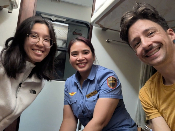 Hai khách người Pháp trên đoàn tàu SE1 bị mắc tại ga Khánh Phước (Gia Lai) do lũ ngập, được nhân viên đường sắt đưa đến sân bay Phù Cát để về TP HCM, sáng 20/11.